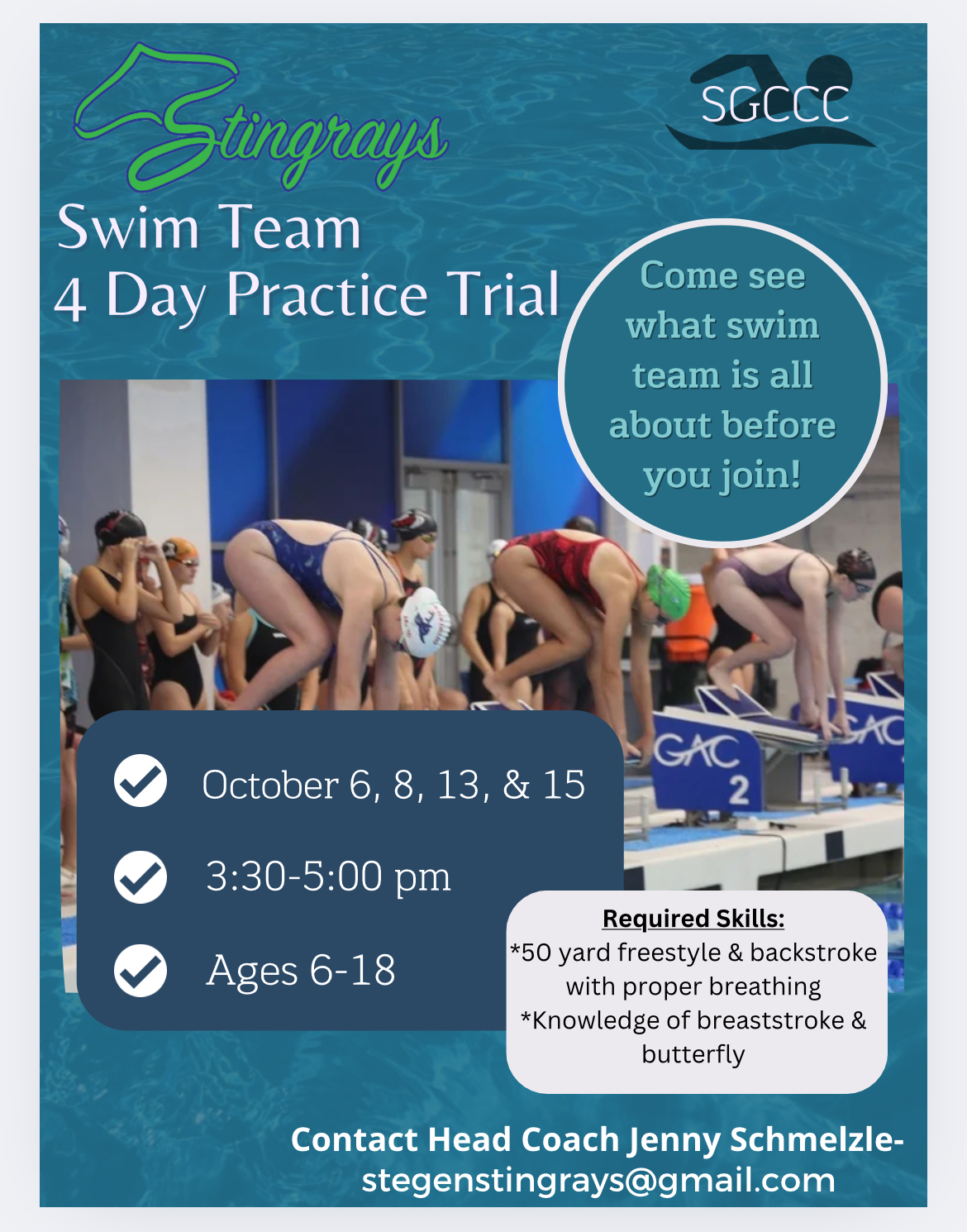 Please contact head coach Jenny Schmelzle at stegenstingrays@gmail.com for more information or if you have any questions.